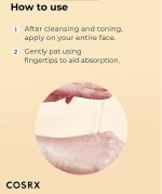 روی پوست مرطوب پس از استفاده از تونر، مقدار مورد نیاز از اسنس را پخش کنید. سپس با استفاده از نوک انگشتان، ضربات ملایمی به پوست بزنید تا محصول بیشتر جذب شود.