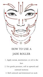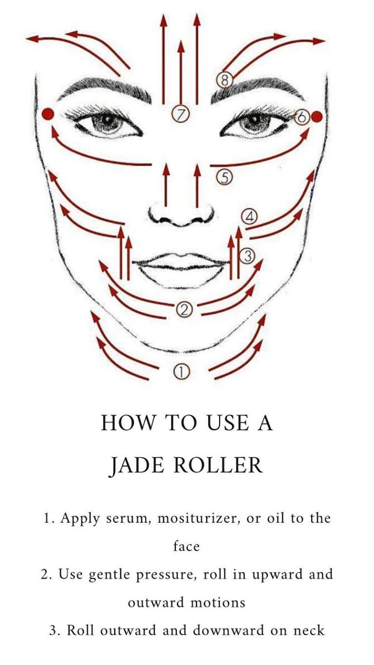 راه دیگری هم وجود دارد: ماساژ را از مرکز چانه شروع کنید. وسیله را بهسمت گوشها روی پوست بالا و پایین بکشید. بعد آن را بهسمت گوشه لبها ببرید و ماساژدادن پوست را ادامه بدهید. کار را دومرتبه از کنار بینی شروع کنید. بعد جید رولر را بهسمت زیر چشمها ببرید و بعد آن را بهشکل افقی به طرف شقیقهها حرکت بدهید. پلکها را هم به همین شکل ماساژ بدهید. پیشانی را هم فراموش نکنید و رولر را از بالای ابروهای بهسمت خط رویش مو بکشید. این حرکات را برای هر دو سمت صورتتان انجام بدهید.